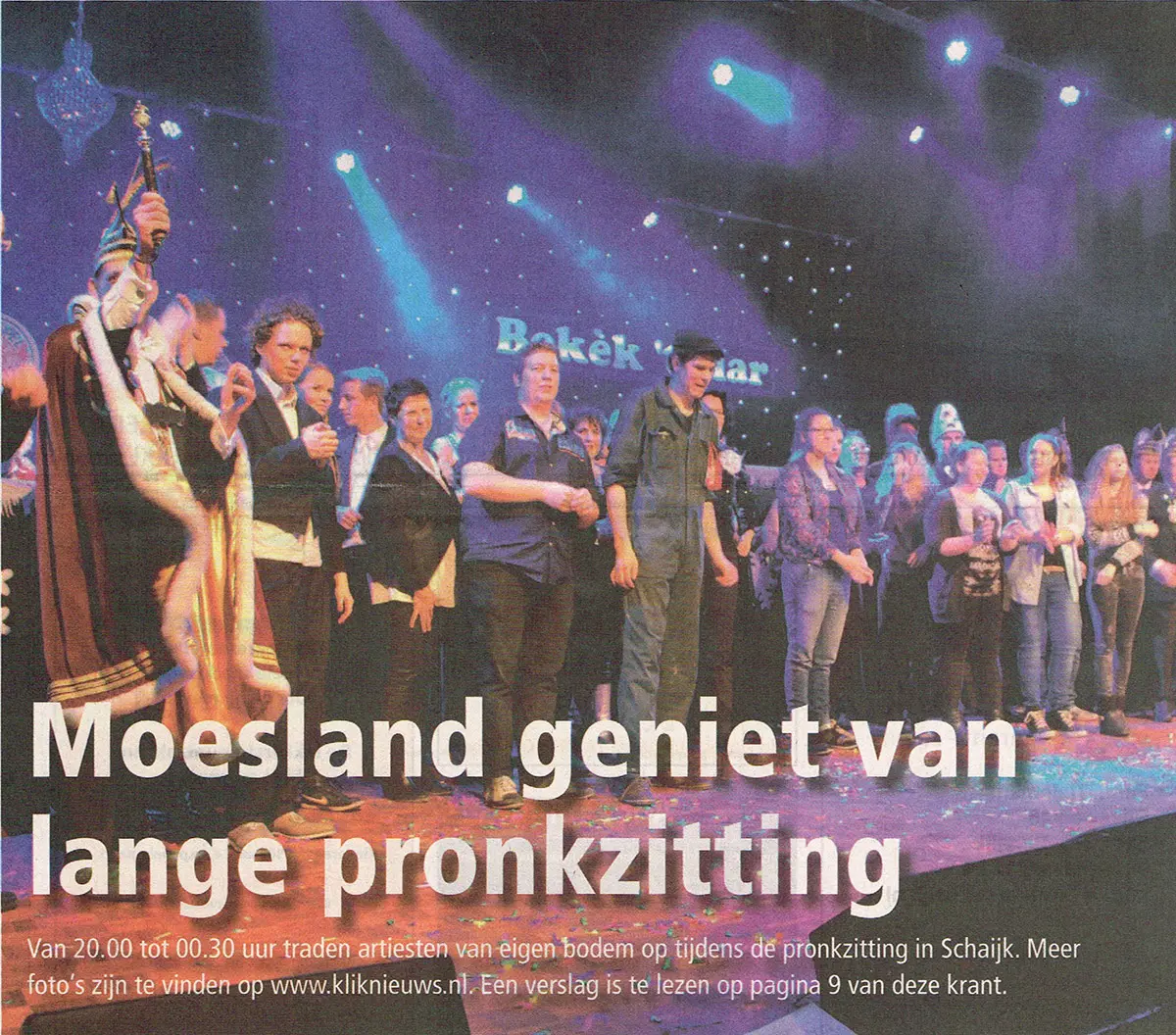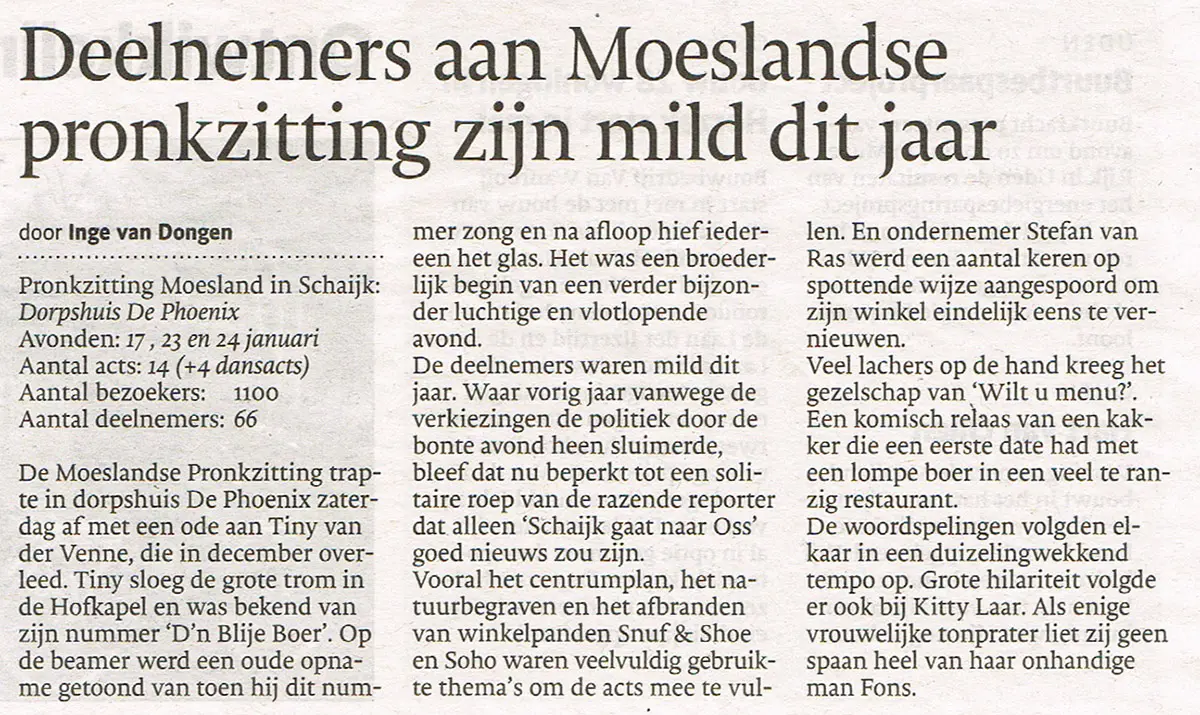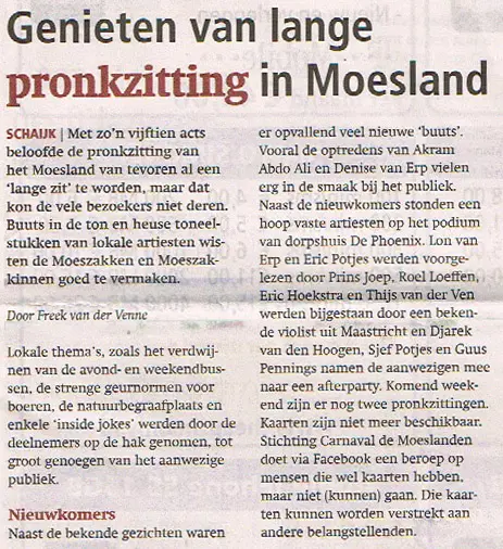 Pronkzitting 2015 in dorpshuis De Phoenix was er een die zijn belofte waarmaakte: een avondvullend spektakel met zo’n vijftien acts en een volle zaal vol Moeszakken en Moeszakkinnen die zich geen moment verveelden. Lokale thema’s, scherpe buuts en verrassend toneel wisselden elkaar in hoog tempo af, precies zoals een echte Moeslandse pronkzitting hoort te zijn.