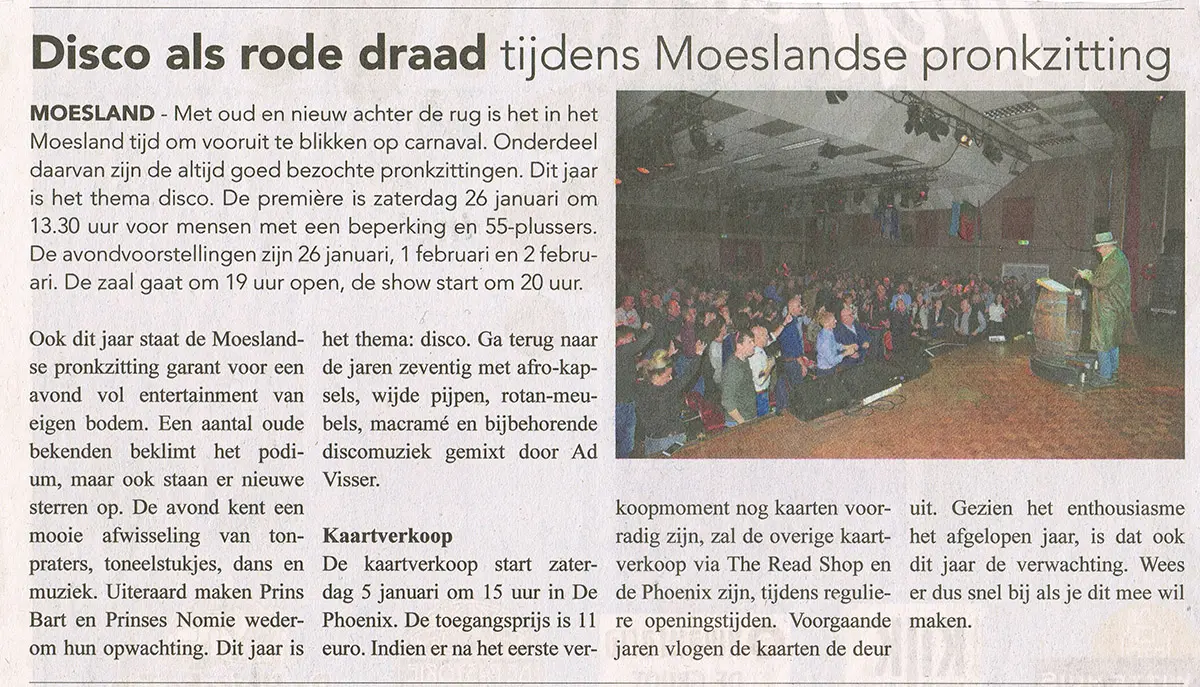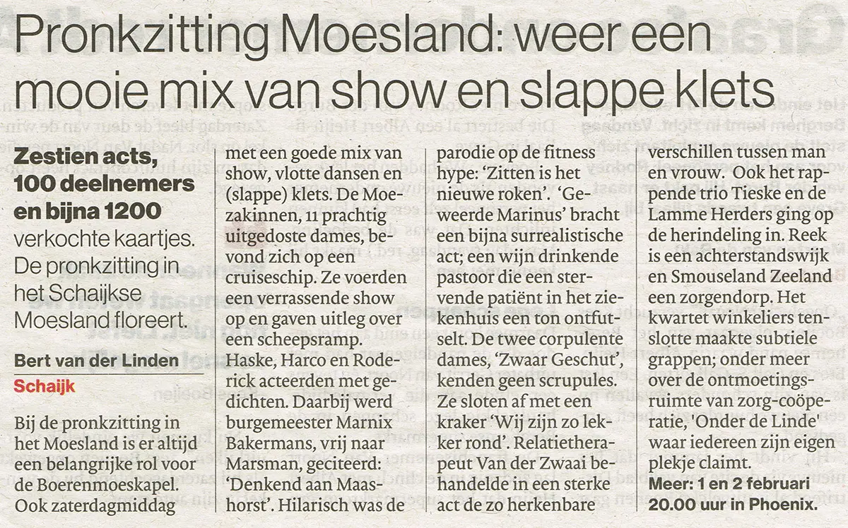 Pronkzitting 2019 bewees eens te meer dat het Moeslandse publiek smacht naar satire, muziek en show van eigen bodem. Met zestien spraakmakende acts, honderd enthousiaste deelnemers en bijna 1200 verkochte kaartjes zat de Phoenix tot de nok toe vol. Een bewijs dat de Moeslandse pronkzitting springlevend is en blijft bruisen van energie, creativiteit en verbondenheid.