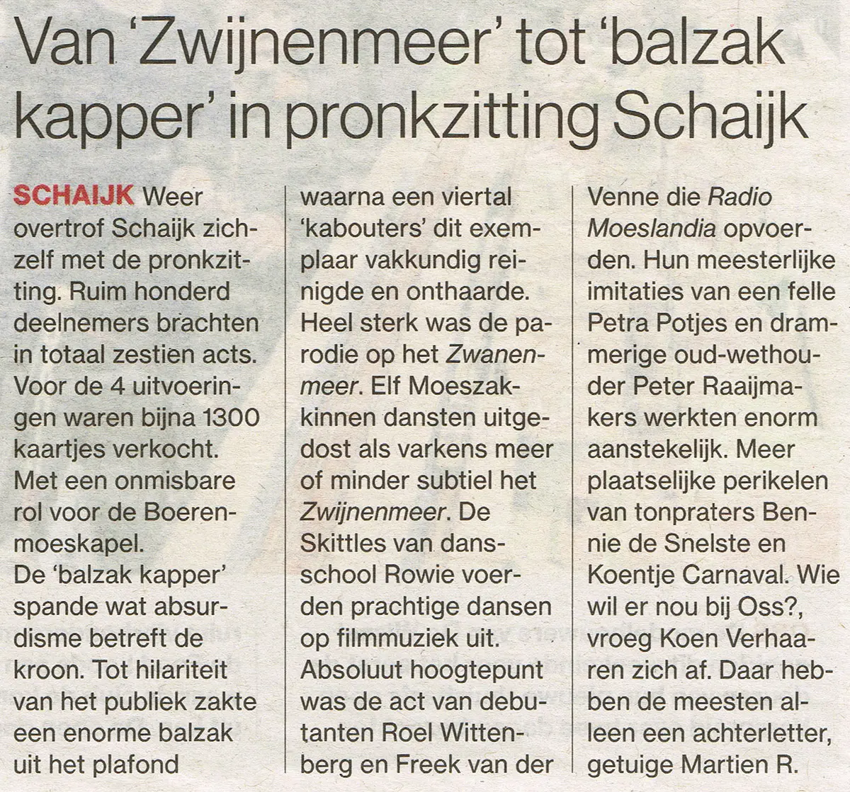 Pronkzitting 2020 bewees opnieuw dat Schaijk barst van het creatieve talent. Voor deze 41e editie van de Moeslandse pronkzitting kwamen meer dan honderd deelnemers samen om in maar liefst zestien acts het publiek vier avonden lang te trakteren op satire, muziek, theater en vooral veel plezier. De belangstelling was enorm: bijna 1300 kaartjes vonden hun weg naar enthousiaste Moeszakken en Moeszakkinnen. Het dorpshuis De Phoenix stond opnieuw in vuur en vlam.