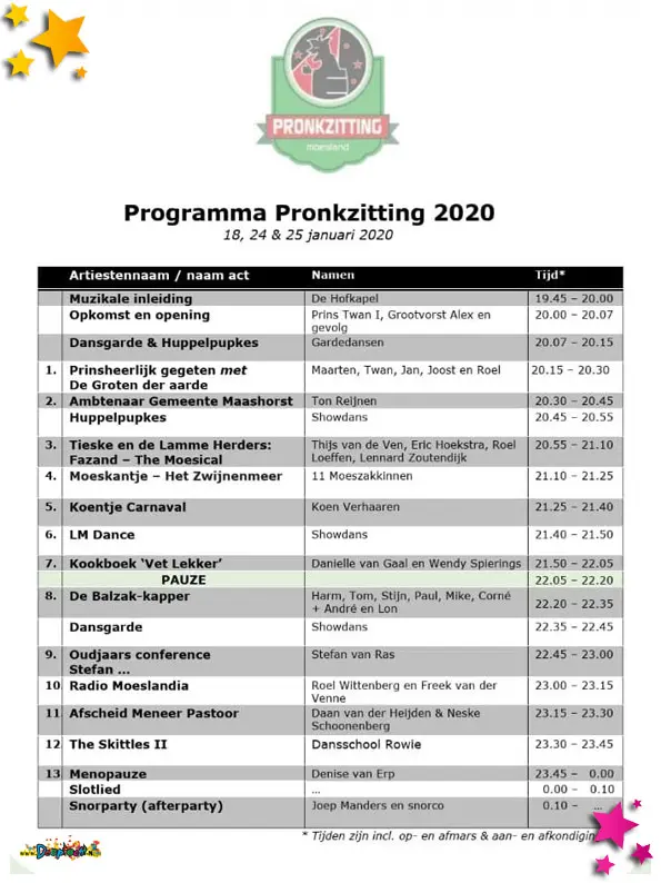 Op 18, 24 en 25 januari 2020 worden om 20.00 uur in De Phoenix de tweeenveertigste Moeslandse Pronkzittingen gehouden. Bijzonderheden; Alexander Schoonenberg is de nieuwe grootvorst en dus ook de nieuwe presentator van de Pronkzittingen in Schaijk. Dit waren de deelnemende artiesten: