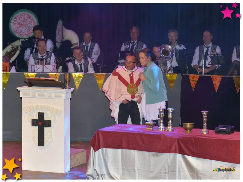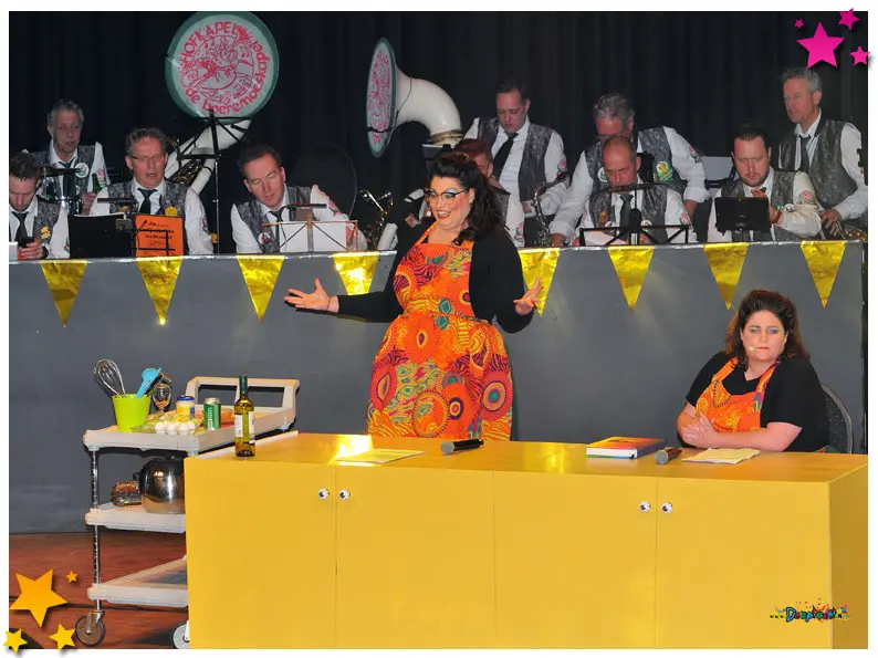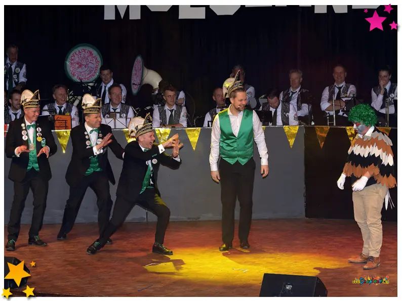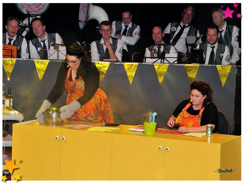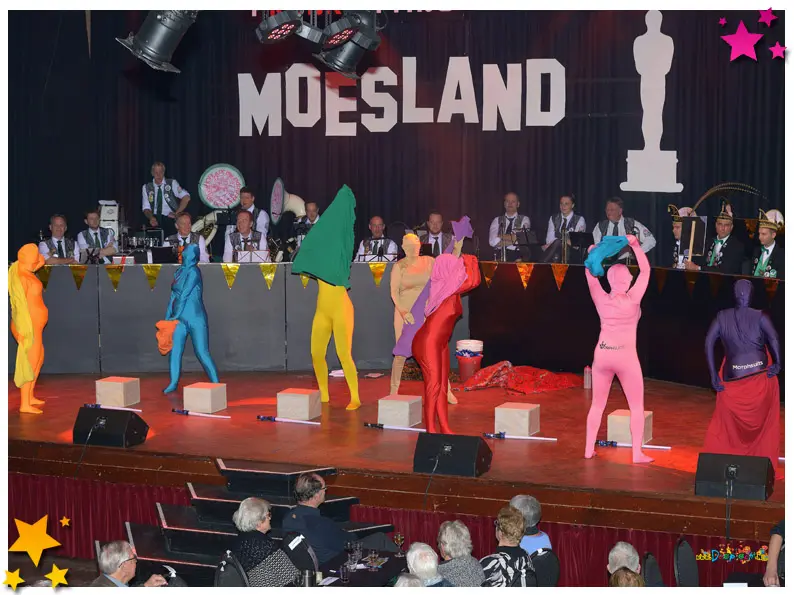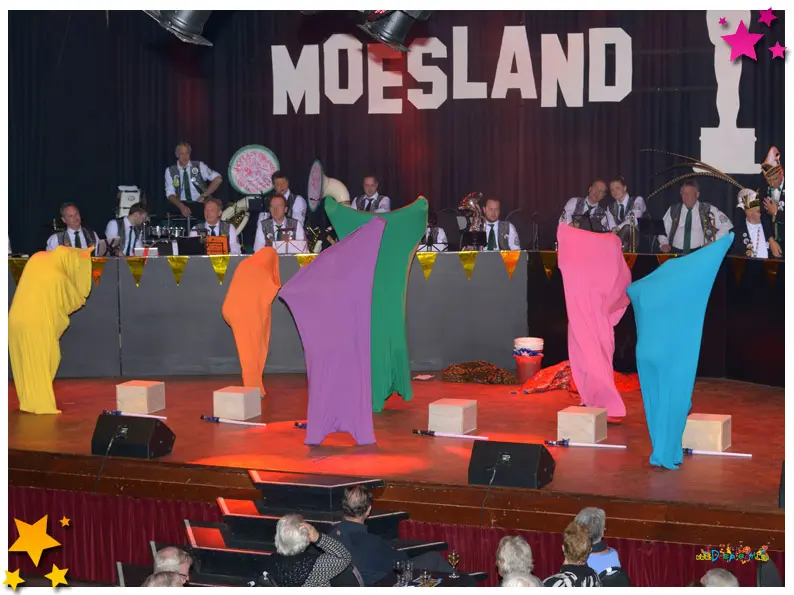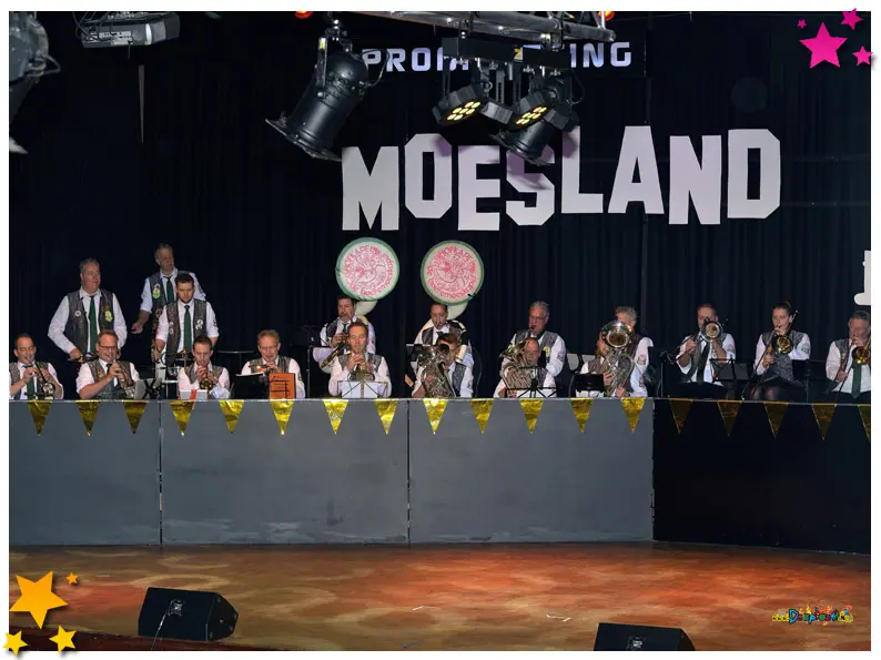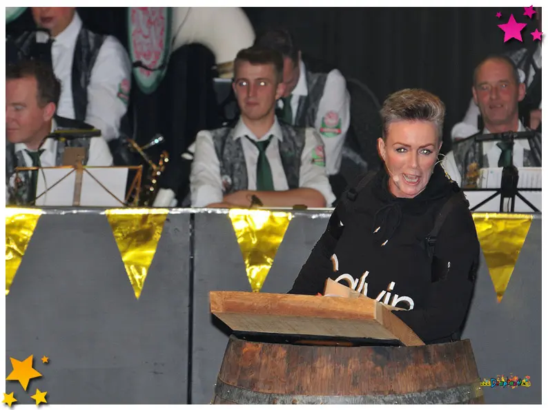 De Boerenmoeskapel, vaste waarde en sfeermaker pur sang, speelde als vanouds een onmisbare rol. Zij zorgden niet alleen voor de muzikale ondersteuning van diverse acts, maar hielden ook de energie in de zaal hoog tussen de optredens door.