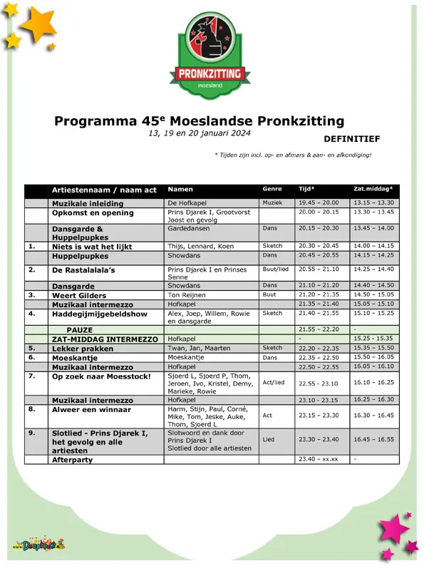 Pronkzitting 2024 vormde de 45e editie van een traditie die in Schaijk al decennialang tot de hoogtepunten van het carnavalsseizoen behoort. Vier uitverkochte avonden in dorpshuis De Phoenix bewezen eens te meer dat het Moesland barst van het talent, de creativiteit én het enthousiasme. En hoewel carnaval nog moest beginnen, heerste er in de zaal al een sfeer alsof het feest al volop losgebarsten was.