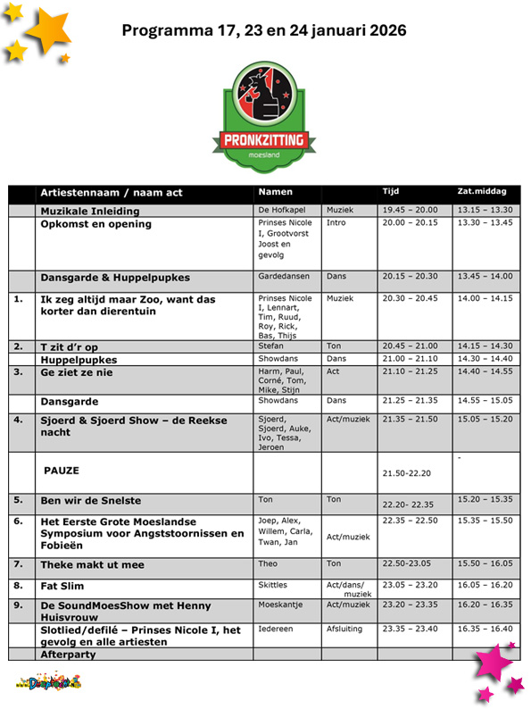 Pronkzitting 2026 liet zien dat de Moeslandse pronkzittingen nog altijd springlevend zijn. Met een mooie mix van traditie, zelfspot, muziek en lokaal talent werd het opnieuw een editie om met plezier op terug te kijken. De afsluiting met het slotlied en het defilé bracht alle artiesten nog één keer samen en vormde een passend einde van drie geslaagde pronkzittingen in 2026.