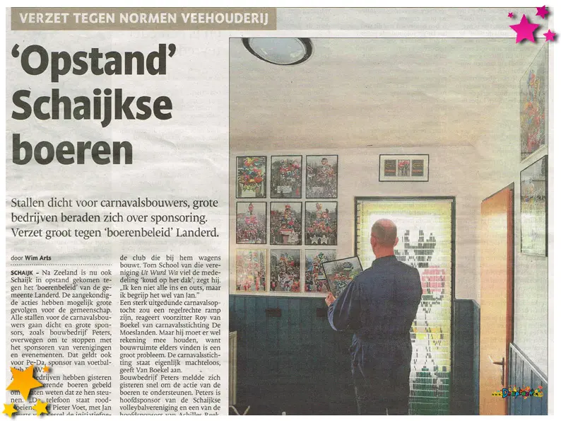 Nog vur dà ut carnavalsseizoen begint, is ut Moesland al in rep en roer. Kunne wel of nie bouwe. Ik heb wel un mening mar ik meng me mar nie in dizze diskussie. Ik zeg mar zöe as ut makkelijk kan, doen ze toch moeilijk bè de geminte. En dan kijke ze noar PL en noar Prins Joep. Da sloa dus nergens op. Vremd wàr ut, echte carnavalsminsse zöe as Peter Loeffen, Pieter Voet, Robbert van de Bolt en Jan Geurts van Kessel die zegge bè ons wurd er niet gebouwd. Zat erover er mag gewoon gebouwd worre en gelukkig ok. Want ut Moesland zonder optocht, is as Sinterkloas zonder zwarte Piet. Clubs zonder bouwouders, is as moes zonder woorst.