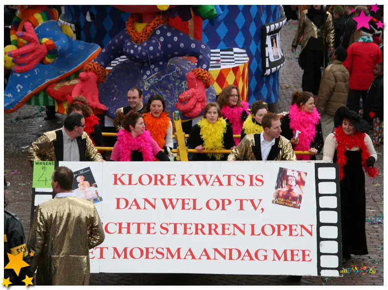 In 2006 werd Klôre Kwats tijdens de bouw van hun wagen op de voet gevolgd door Omroep Brabant. En wat past daar beter bij dan een thema dat volledig draait om sterren op het scherm? Hun idee “Klôre Kwats is dan wel op tv, de echte sterren lopen Moesmoandag mee” sloot perfect aan bij deze unieke ervaring.