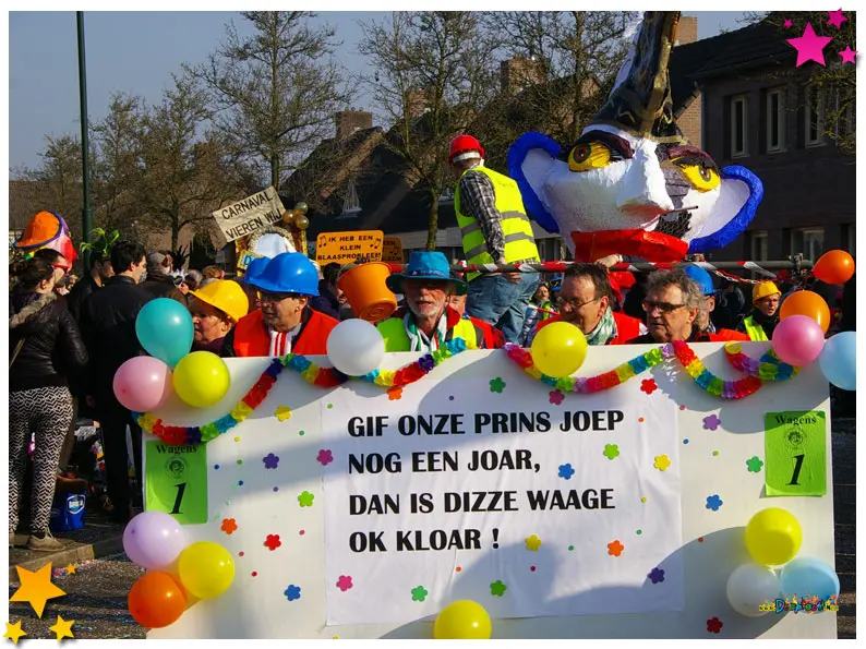 Carnavalsvereniging Auwzum trapte af met een uniek eigen lied over hun clubgenoot en prins: Prins Joep I. Hun thema “Gif ônze Prins Joep nog un joor, dan is dizze waage ok kloar” zorgde voor een hoop gelach en herkenning. De wagen was, zoals de titel al voorspelde, nog lang niet af, maar het enthousiasme en de humor maakten dat meer dan goed. Een echte Moeslandse klassieker in de dop.