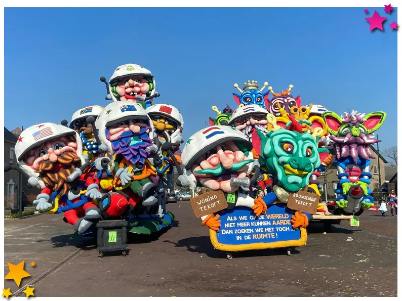 DGUW Gruwelijk Locht ging letterlijk en figuurlijk de ruimte in. Hun indrukwekkende bouwwerk (eigenlijk twee wagens in één) draaide om het thema “Als we op de wereld niet meer kunnen aarde, dan zoeken we het toch in de ruimte.” Het krachtige themamuziekje maakte het geheel compleet en leverde hen terecht de 1e prijs bij de wagens op.