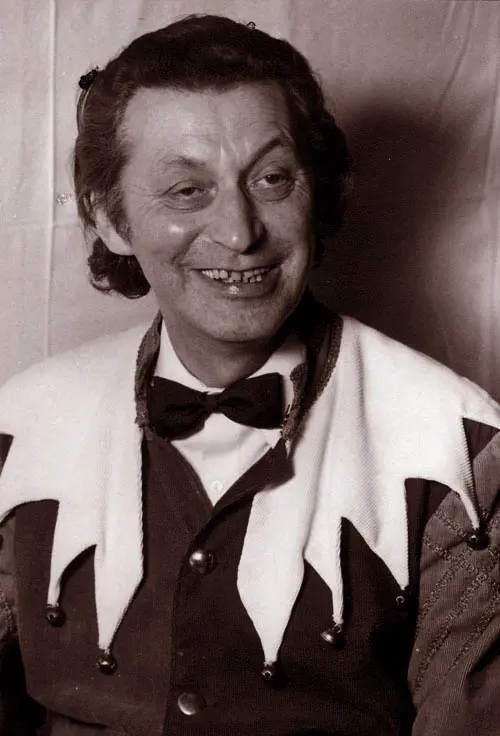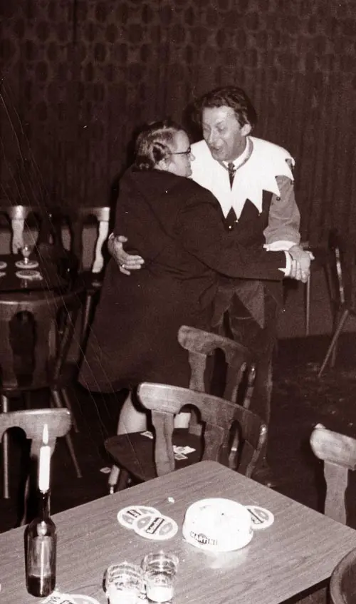 ‘Optreden’ zoals Wim dat graag deed: in een volle zaal, met of zonder microfoon. Aan zijn voeten de Dansmariekes met aan elke kant een dochter; Jozien en Henriette.