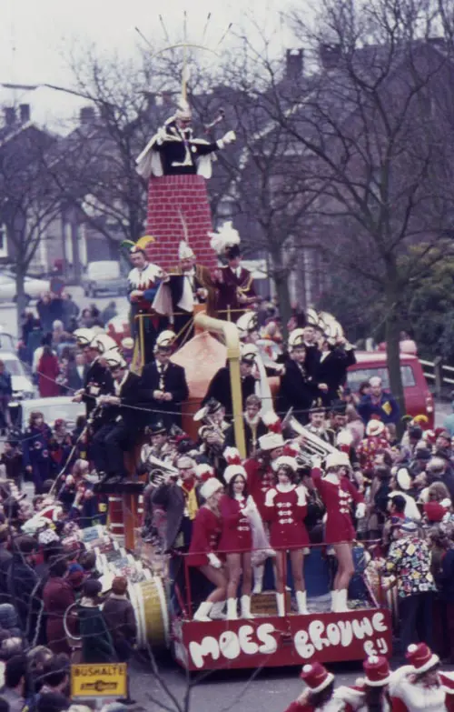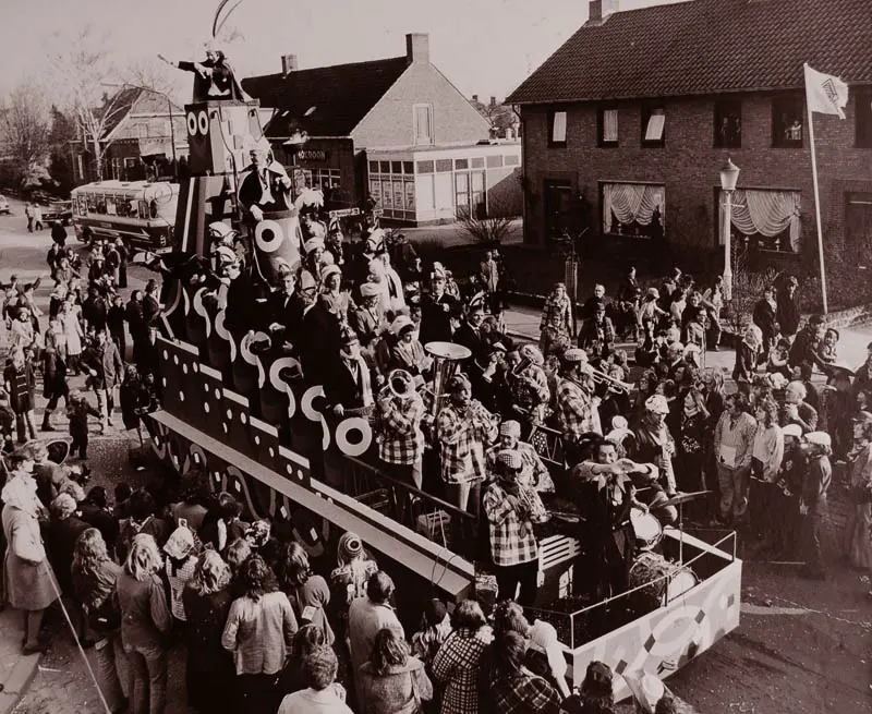 De prinsenwagen compleet met Dansmariekes, Hofkapel, Moesnar, Prins en zijn gevolg trekken door de Pastoor van WInkelstraat (zijstraat is richting Europaplein > Op de plek van die loods staat nu Plein-5)