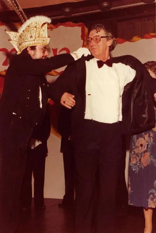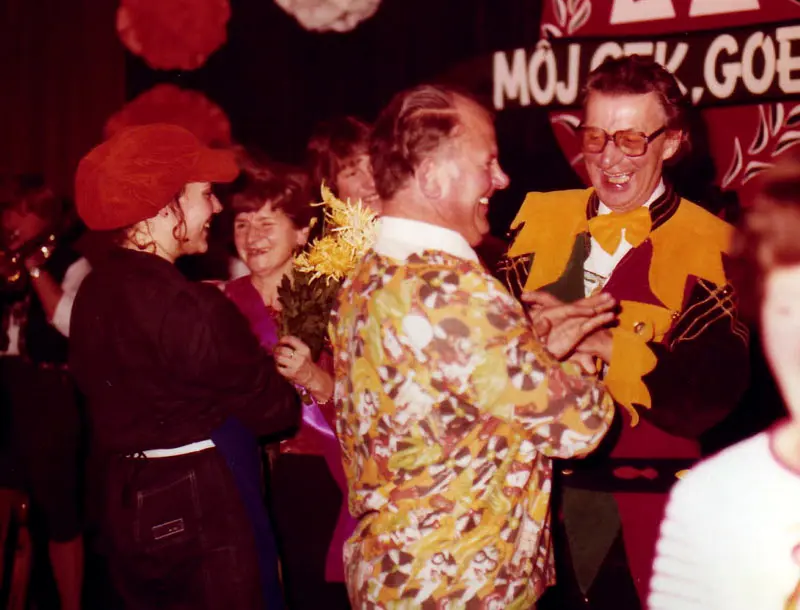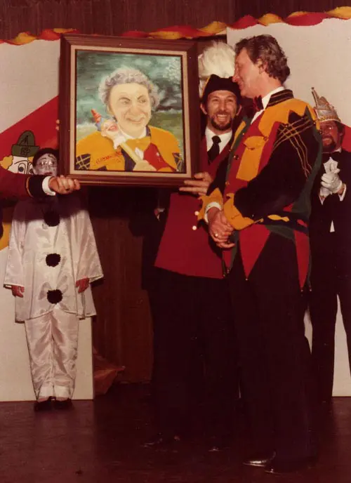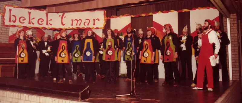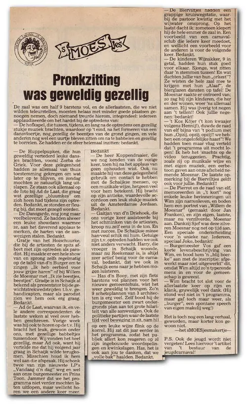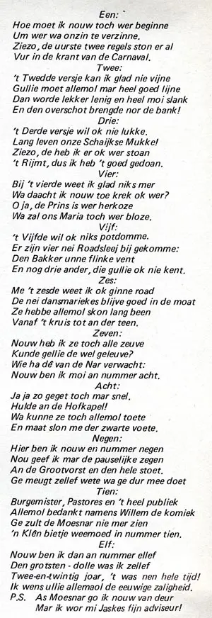 Na 22 jaar nar geweest te zijn neemt Willem De Moesnar in 1982 afscheid van die functie. Wel blijft hij aan als adviseur van Stichting Carnaval de Moeslanden. De pronkzitting van dat jaar stond behoorlijk in het teken van dit afscheid. Hier een optreden van Ut Kos Koier waar 3 dochters van Wim en Roos lid van waren. Peter Henst, in het rood gekleed zong voor; “Onze Willem de Moesnar, Onze Willem de Moesnar, Onze Willem de Moesnar”. [ Bas Griffioen ]