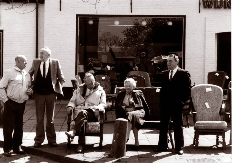 Deze foto is geloof ik ooit gemaakt door Gerard Faassen, lid van de fotoclub en overbuurman van Wim Wijnakker Senioren-feauteuils. Zoals je ziet wordt er vooral met oude vrienden gekletst en niet zozeer iets verkocht. (aan de spiegeling in de ramen te zien is de foto gemaakt tijdens de braderie of zo…)